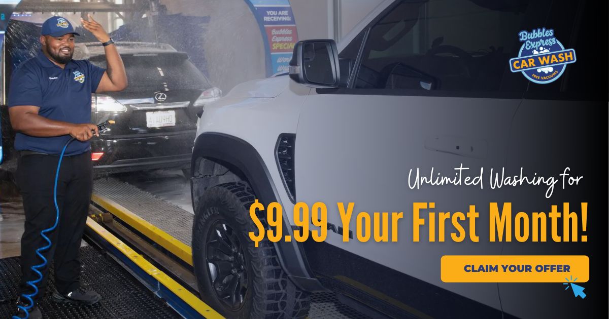Join Bubbles Express, and enjoy your first month of unlimited washing for only $9.99. Start shining today. Get unlimited washing for your first month at just $9.99.
