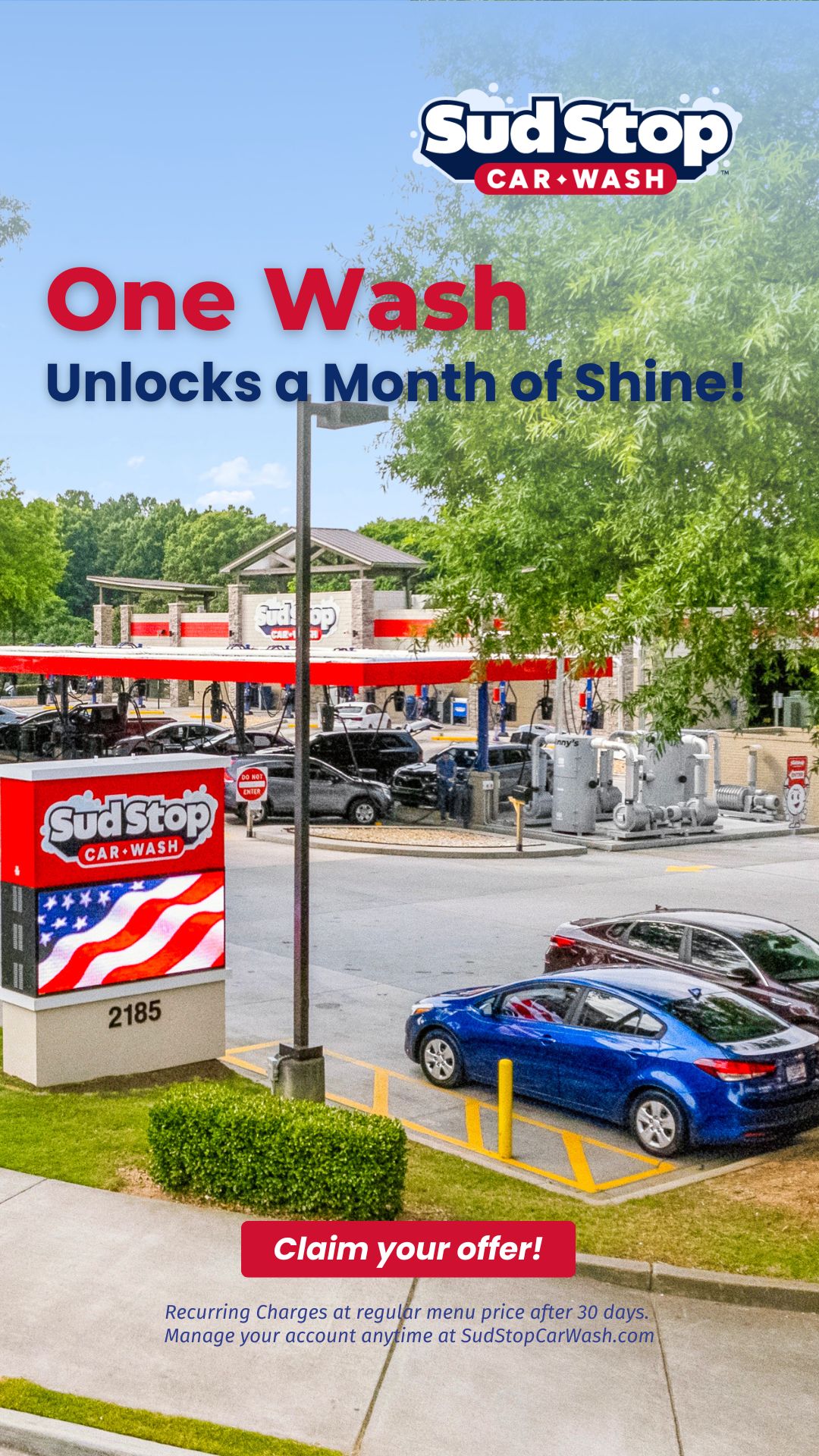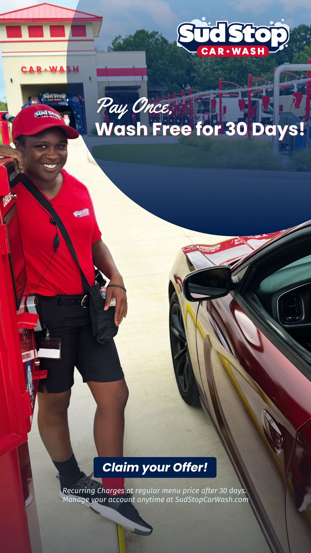 Recurring Charges at regular menu price after 30 days. Manage your account anytime at SudStopCarWash.com