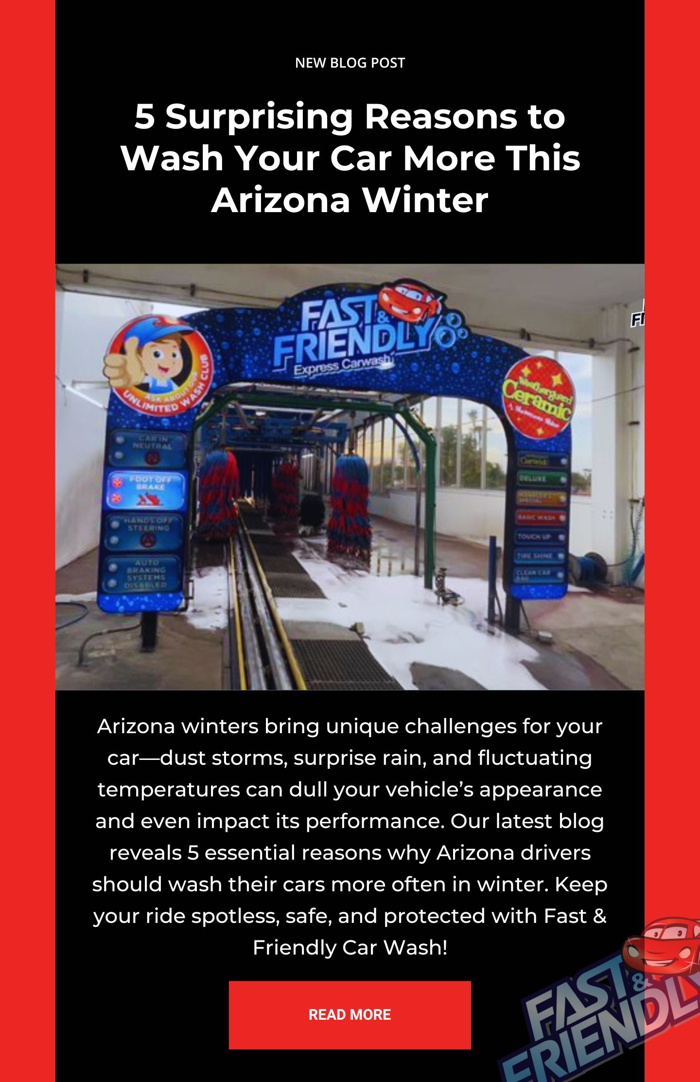While Arizona’s winter may not come with snow, it still presents unique challenges that can affect your car’s condition. From dust storms to unexpected showers, keeping your vehicle clean is essential to preserve its appearance, value, and safety. Fast & Friendly’s quick, efficient car washes, eco-friendly solutions, and convenient membership options make it easy to maintain your car all winter long.