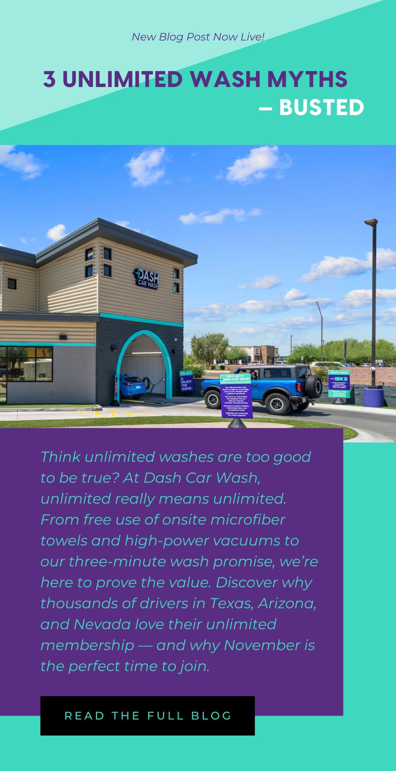 Don’t let myths hold you back. Unlimited washes at Dash Car Wash are truly unlimited, fast, and worth every penny. Join thousands of members across Texas, Arizona, and Nevada who already know the secret: life’s just better when you love that clean car feeling.