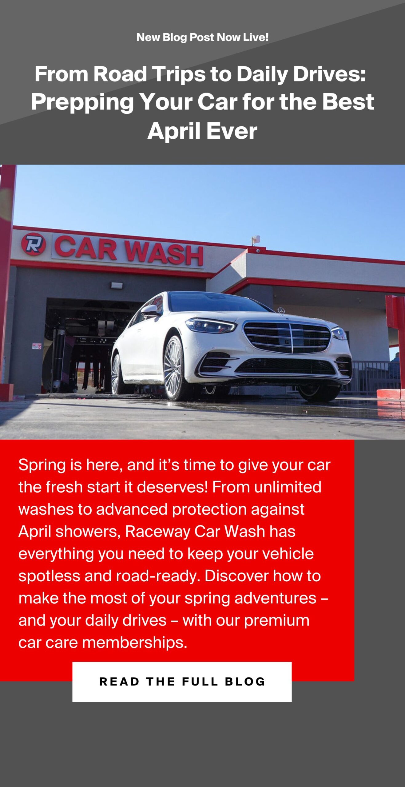 April is all about fresh starts, and your car deserves one too! Whether you’re preparing for exciting road trips or just making your daily drives more enjoyable, Raceway Car Wash helps you maintain a clean, protected, and road-ready vehicle. Sign up for an Unlimited Wash VIP Membership today and make this April the cleanest, most exciting one yet!